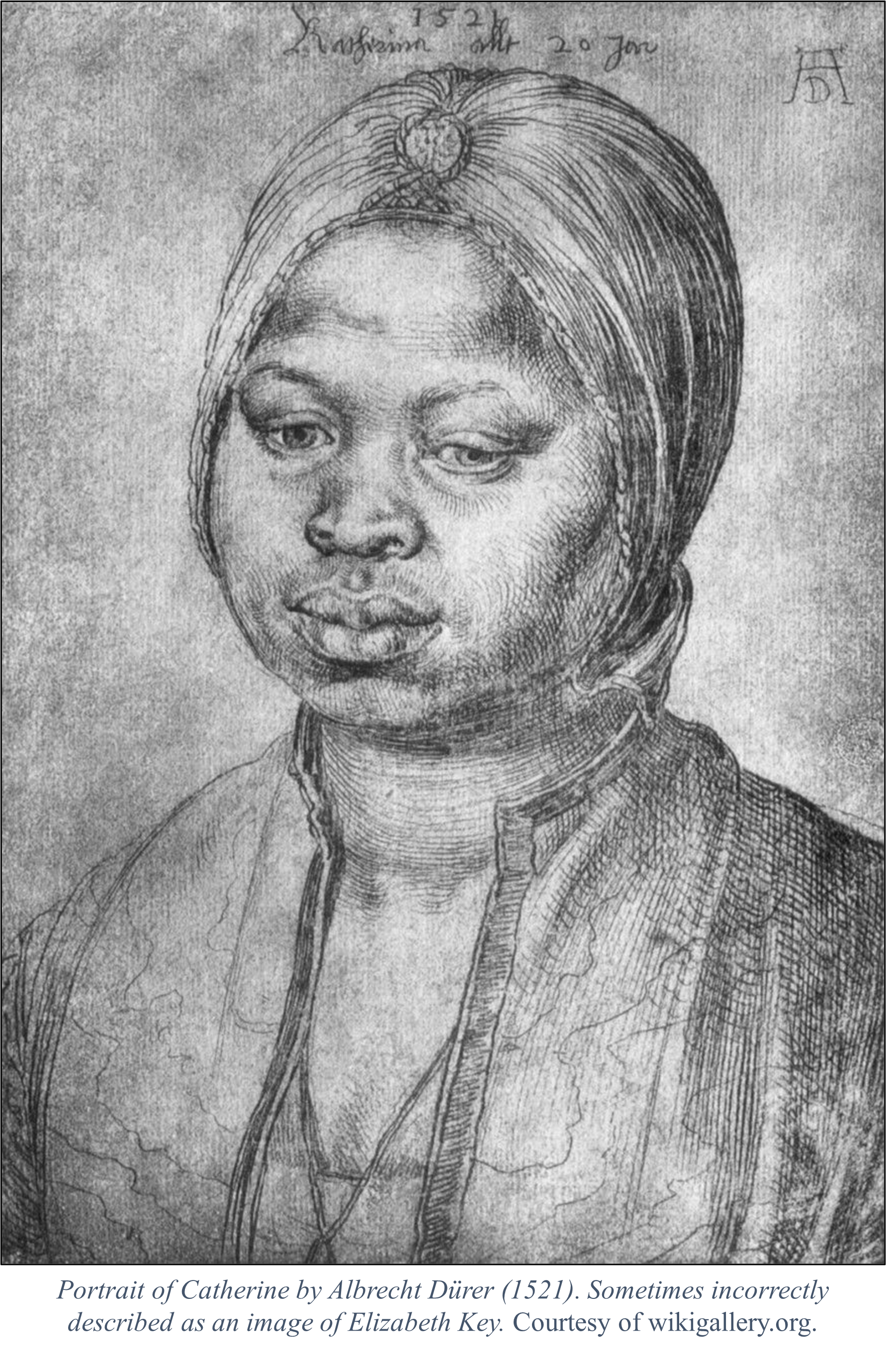 Confusion has also been sown by scholars and by Key’s descendants. For example, a silverpoint drawing of an African woman, frequently included with information about Elizabeth Key, has circulated widely on the internet, including by Elizabeth Key’s descendants (see, for example, http://jonesandrelated.blogspot.com/2012/02/elizabeth-key-grinstead.html). The image was actually drawn by the German painter, Albrecht Dürer, in 1521 (more than a century prior to Key’s birth) , titled “The Negress Katherina.” (see, for example, https://curiator.com/art/albrecht-duerer/the-negress-katherina) and should under no circumstance be taken as a likeness of Elizabeth Key.